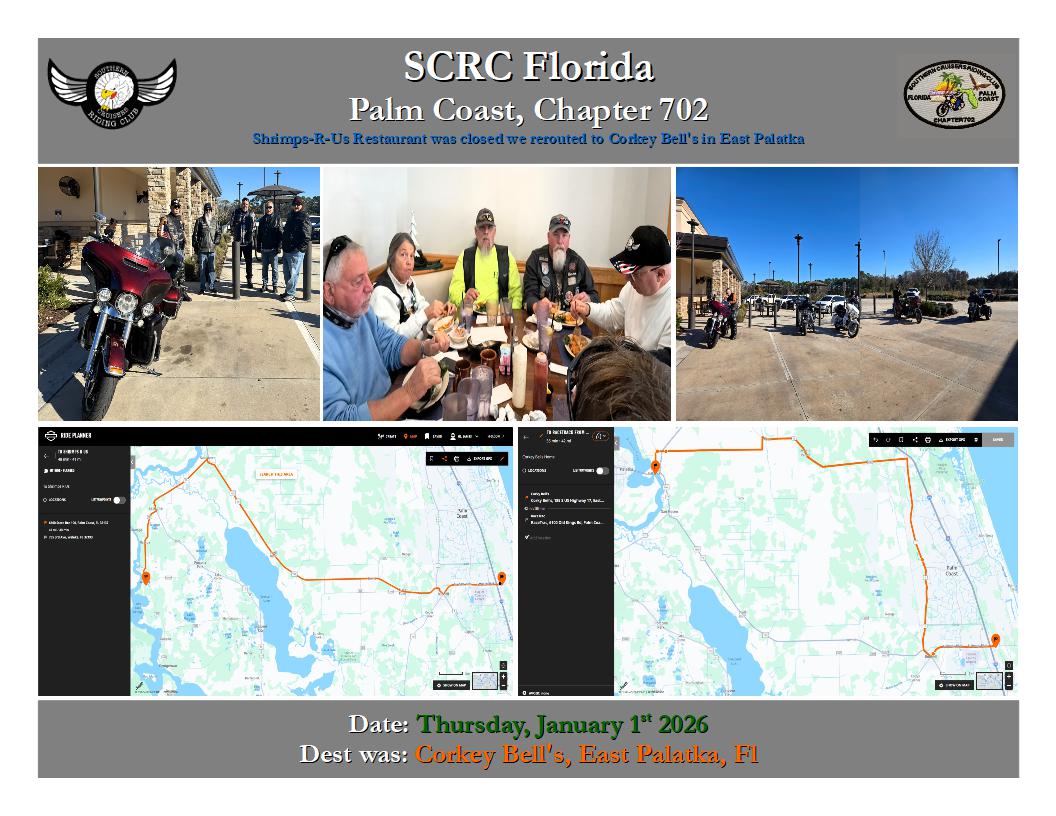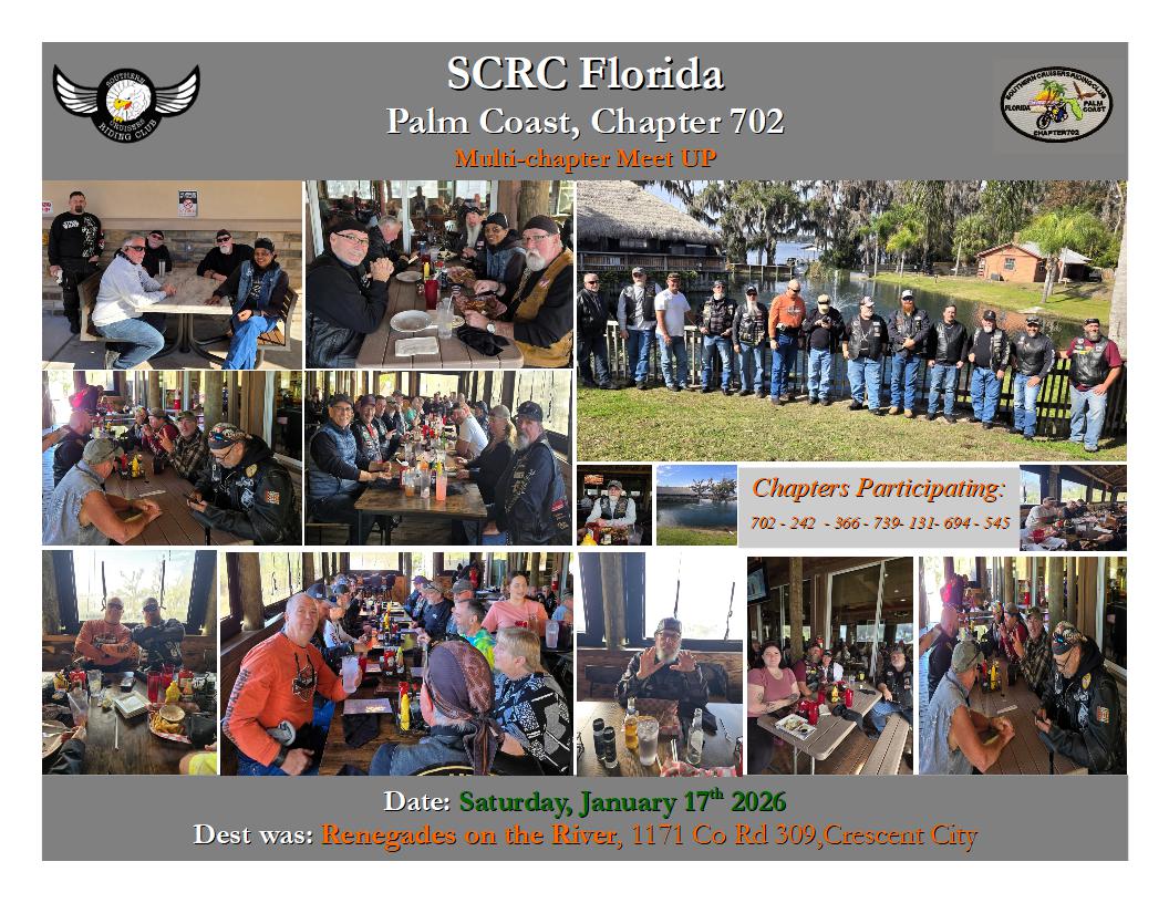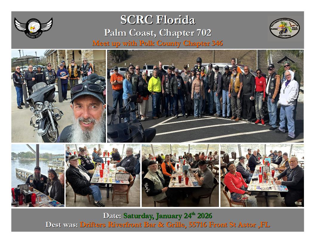 UP Chapters: 702 - 694 - 346 Saturday, January 24, 2025 Dest was: Drifters Riverfront Bar&Grille, 55716 Front St Astor , FL |