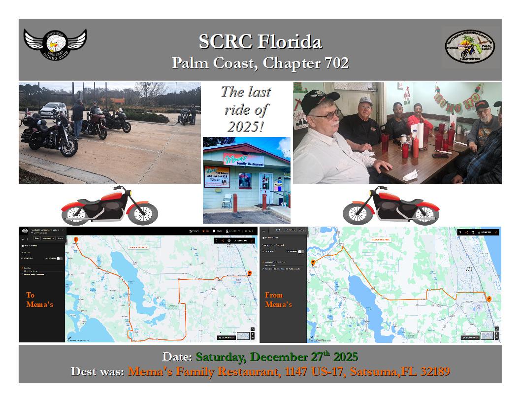 RIDE Saturday, December 27, 2025 Dest was: Mema's Family Restaurant, 1147 US-17, Satsuma, Fl 32189 |
