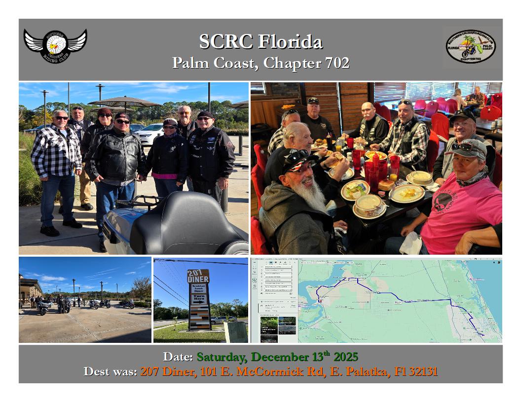 RIDE Saturday, December 13, 2025 Dest was: 207 Diner, 101 E. McCormick Rd, E. Palatka, Fl 32131 |