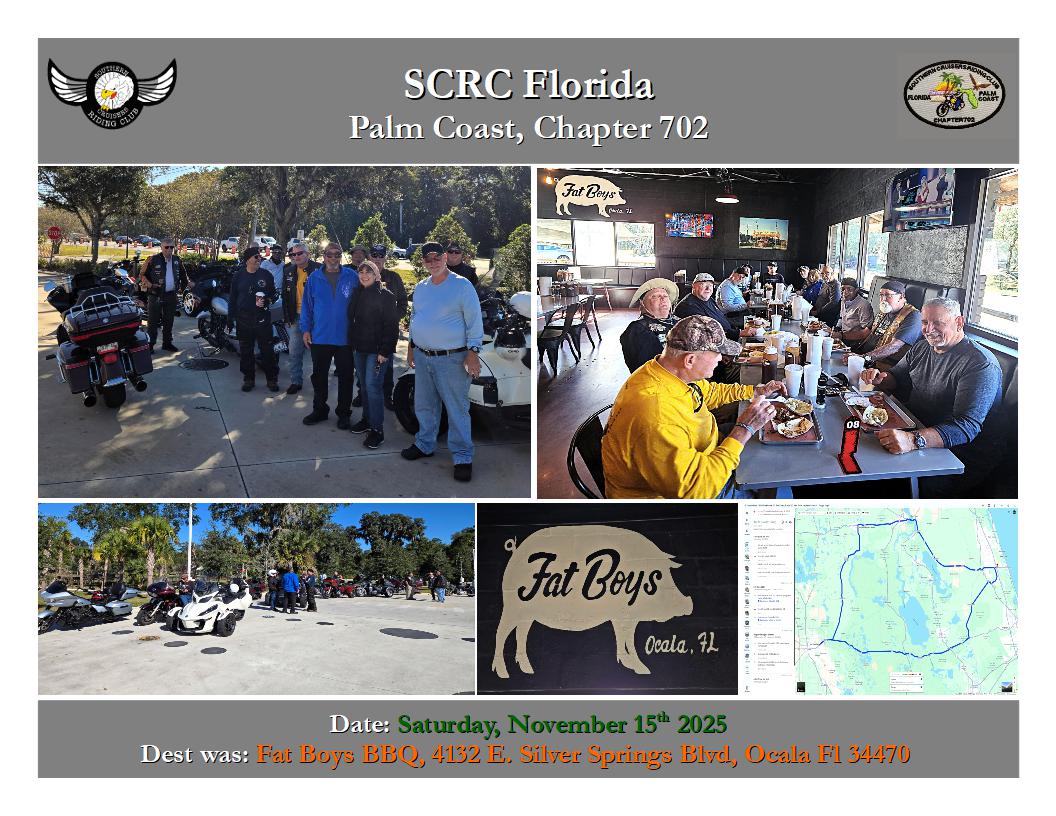 RIDE Saturday, November 15, 2025 Dest was: Fat Boys BBQ, 4132 E Silver Springs Blvd, Ocala,FL 34470 |