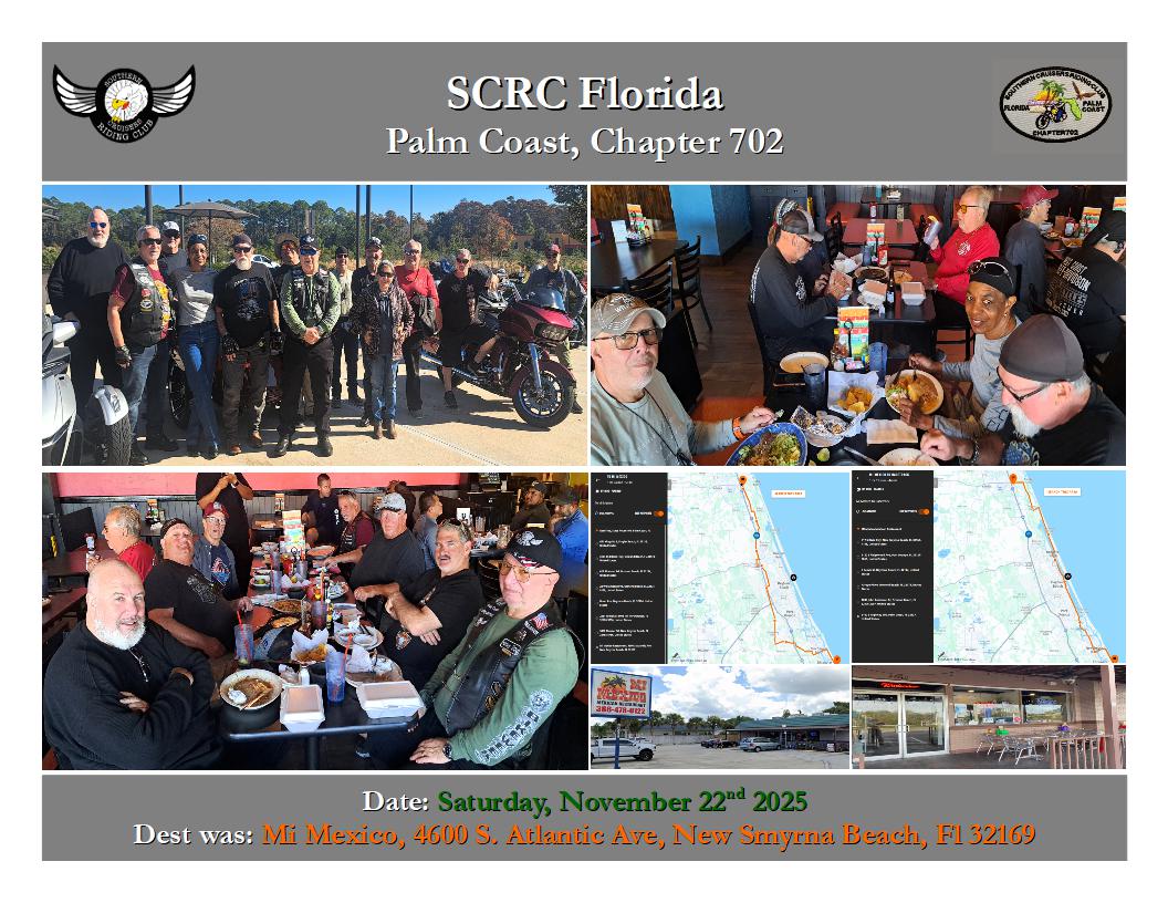 RIDE Saturday, November 22, 2025 Dest was: Mi Mexico, 4600 S. Atlantic Ave, New Smyrna Beach, Fl 32179 |