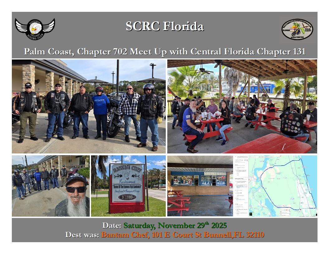 Chapter 702 completed a 92 mile long way around to meet-up with Chapter 131 at Bantam Chef in Bunnell.7 riders headed out on a cool,but windy day and arrived safely to the destination. A shout out to Rob"Bumper" for getting his Road Captain patch and leading his first ride.Congrats!